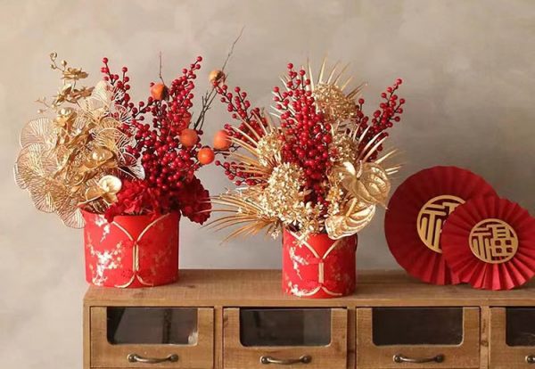 Crafted with meticulous attention to detail, each flower is delicately designed to replicate the beauty of fresh holly. The vibrant red fruits add a pop of color, radiating positivity and good fortune. With a total of 12 forked stems, our lucky bucket arrangement offers an abundance of blessings for any occasion.