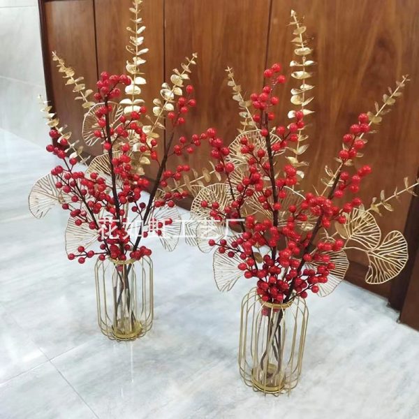 Golden eucalyptus ginkgo fan leaf plastic artificial flower holly red fruit lucky barrel New Year’s Eve flowers